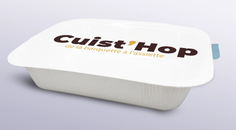 La barquette alimentaire Cuist’Hop permet de passer directement de la barquette à l’assiette. Grâce à son système breveté d’ouverture par le dessous, Cuist’Hop réduit les manipulations, optimise les temps de service et simplifie la logistique en cuisine.